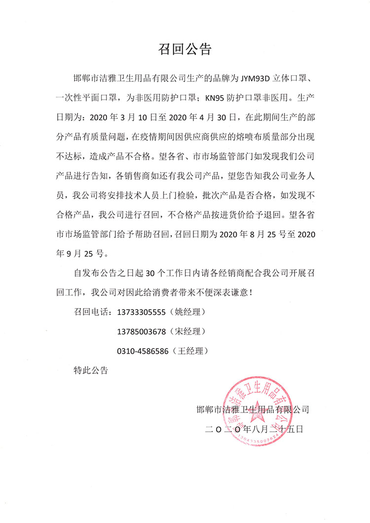 邯鄲市潔雅衛(wèi)生用品有限公司生產(chǎn)的品牌為JYM93D立體口罩一次性平面口罩,為非醫(yī)用防護(hù)口罩;KN95 防護(hù)口罩非醫(yī)用。生產(chǎn)日期為:2020年3月10日至2020年4月30日,在此期間生產(chǎn)的部分產(chǎn)品有質(zhì)量問題,在疫情期間因供應(yīng)商供應(yīng)的熔噴布質(zhì)量部分出現(xiàn)不達(dá)標(biāo),造成產(chǎn)品不合格。望各省、市市場(chǎng)監(jiān)管部門如發(fā)現(xiàn)我們公司產(chǎn)品進(jìn)行告知,各銷售商如還有我公司產(chǎn)品,望您告知我公司業(yè)務(wù)人員,我公司將安排技術(shù)人員上門檢驗(yàn),批次產(chǎn)品是否合格,如發(fā)現(xiàn)不合格產(chǎn)品,我公司進(jìn)行召回,不合格產(chǎn)品按進(jìn)貨價(jià)給予退回。望各省市市場(chǎng)監(jiān)管部門給予幫助召回召回日期為2020年8月25號(hào)至2020年9月25號(hào)